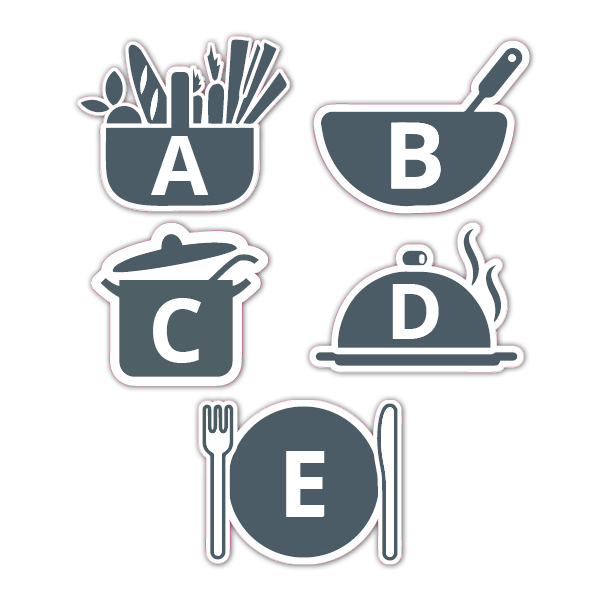Autocollants A,B,C,D,E à disposer sur les meubles de l’espace technique pour guider les nouveaux dans le suivi des dossiers.